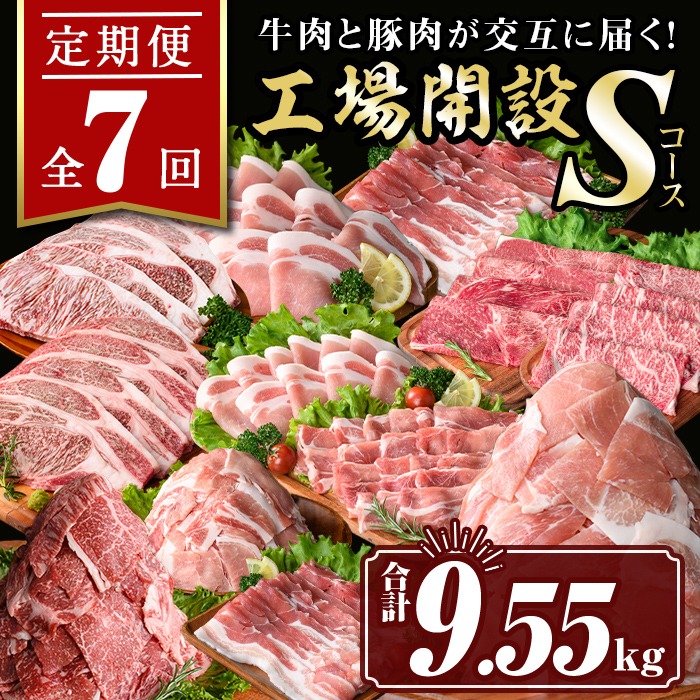 isa448 【定期便7回】工場開設Sコース (合計9.55kg) 国産 肉 牛肉 豚肉 厚切り 切り落とし 霜降り すきやき しゃぶしゃぶ 生姜焼き 牛しゃぶ 冷凍 ロース カタロース 肩ロース サーロイン ステーキ アウトドア BBQ 食べ比べ セット 【サンキョーミート株式会社】