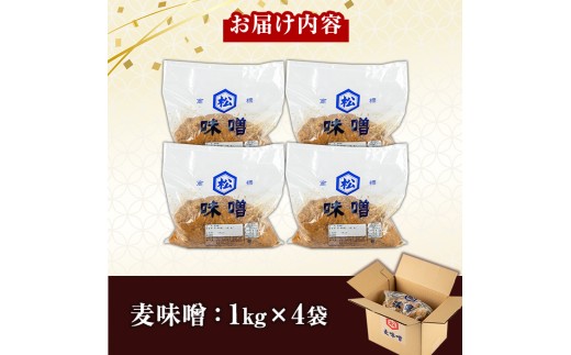 - 国産 無添加 麦味噌 4kg(1㎏×4個)セット 鹿児島 麦みそ 手作り 麦 麦みそ むぎ 味噌 味噌汁 みそ汁 てづくり 麹 こうじ 調味料 加工品 加工食品 栄養 健康【A-1971H】