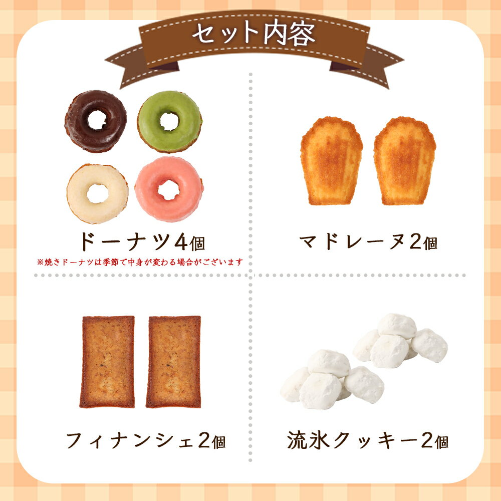 - 【ふるさと納税】焼きドーナツセット 4個入り(季節で中身変わる)マドレーヌ2個、フィナッシェ2個、流氷クッキー2個【0900102】