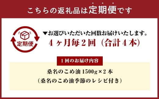【4ヶ月毎定期便2回】桑名のこめ油 1500g × 2本入り 桑名のこめ油季節のレシピ付き (合計:4本 (6000g) ) / 米油 こめあぶら 油 あぶら 食用油 食用 調理用油 調理用 レシピ付き 桑名市産 米ぬか 国産 揚げ物 天ぷら 炒め物 ビタミンE 保健機能食品 三重県 桑名市 常温