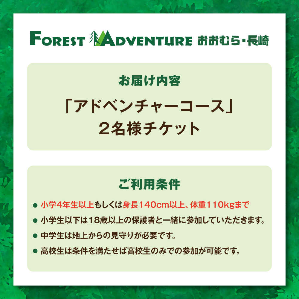 - 【ふるさと納税】ダイナミックでスリリングな樹上体験を! アドベンチャーコース ペアチケット (2名様) / 観光 入園券 チケット 遊ぶ 体験 自然 アクティビティ アスレチック 大人 子ども 満喫 楽しむ 迷路 キッズ 家族 / 大村市 / フォレストアドベンチャー[ACCH002]