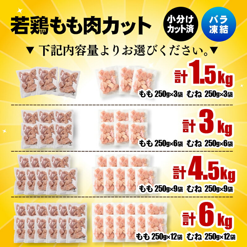 - 【ふるさと納税】「選べる内容量」宮崎県産若鶏 鶏肉 もも・むね肉カット 小分け バラバラ凍結1.5kg・3kg・.5kg・6kg IQF加工 鶏 もも肉 モモ肉 むね身 鶏ムネ肉 ヘルシー ボリューム 筋トレ チキン 蒸し鶏(<1-305> 南九F☆