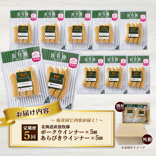 【定期便:5回】北海道産放牧豚 無添加ポークウインナー・粗挽きウインナー ×各5パック【120059】