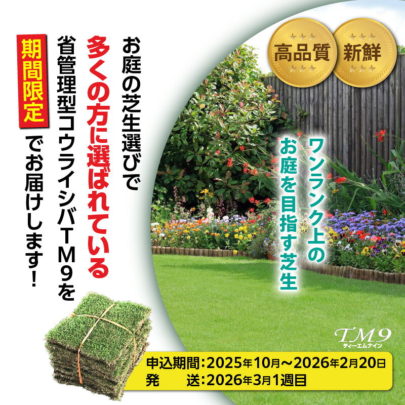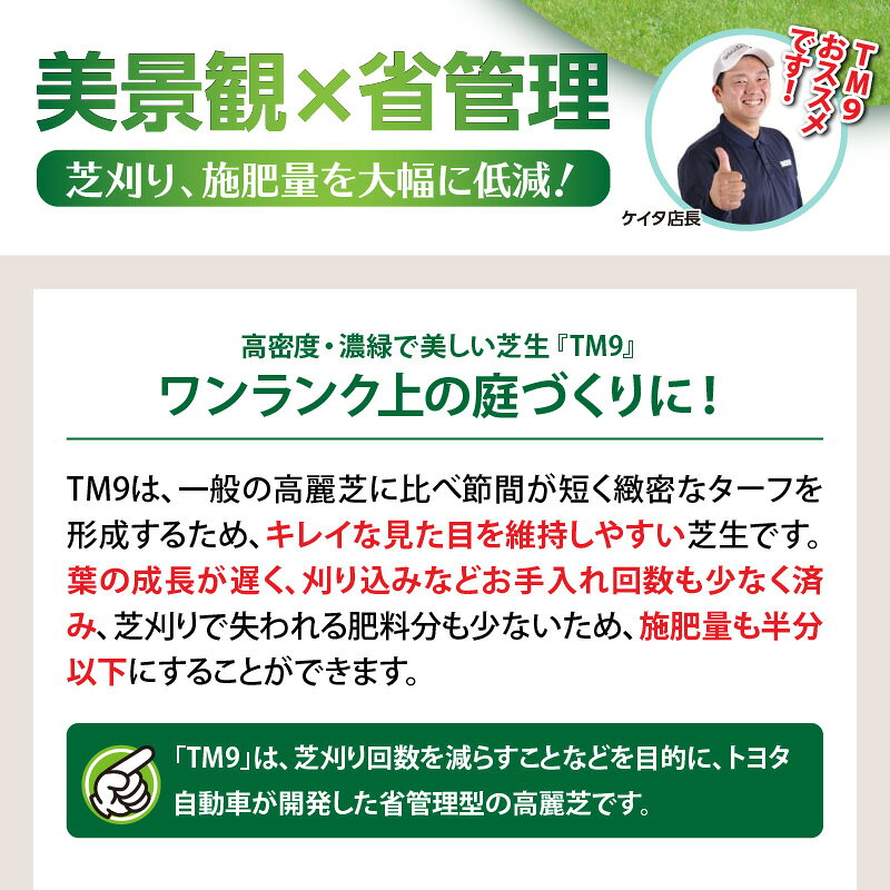 - 【ふるさと納税】【期間限定】<選べる> TM9 ティーエムナイン 省管理型コウライシバ トヨタ自動車(株) 開発品種 1平米 〜 50平米 芝生 芝 天然 庭 高品質 期間限定 限定 お手入れ ガーデニング DIY ハヤシ 鹿児島 鹿屋市 おすすめ ランキング プレゼント ギフト