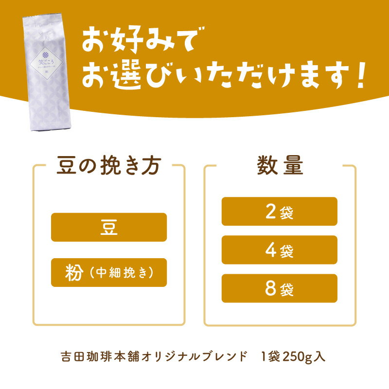 - 【ふるさと納税】【吉田珈琲本舗】選べる 豆 粉! 笑ごころブレンド 250g×2袋 250g×4袋 250g×8袋【配送不可地域:北海道・沖縄・離島】