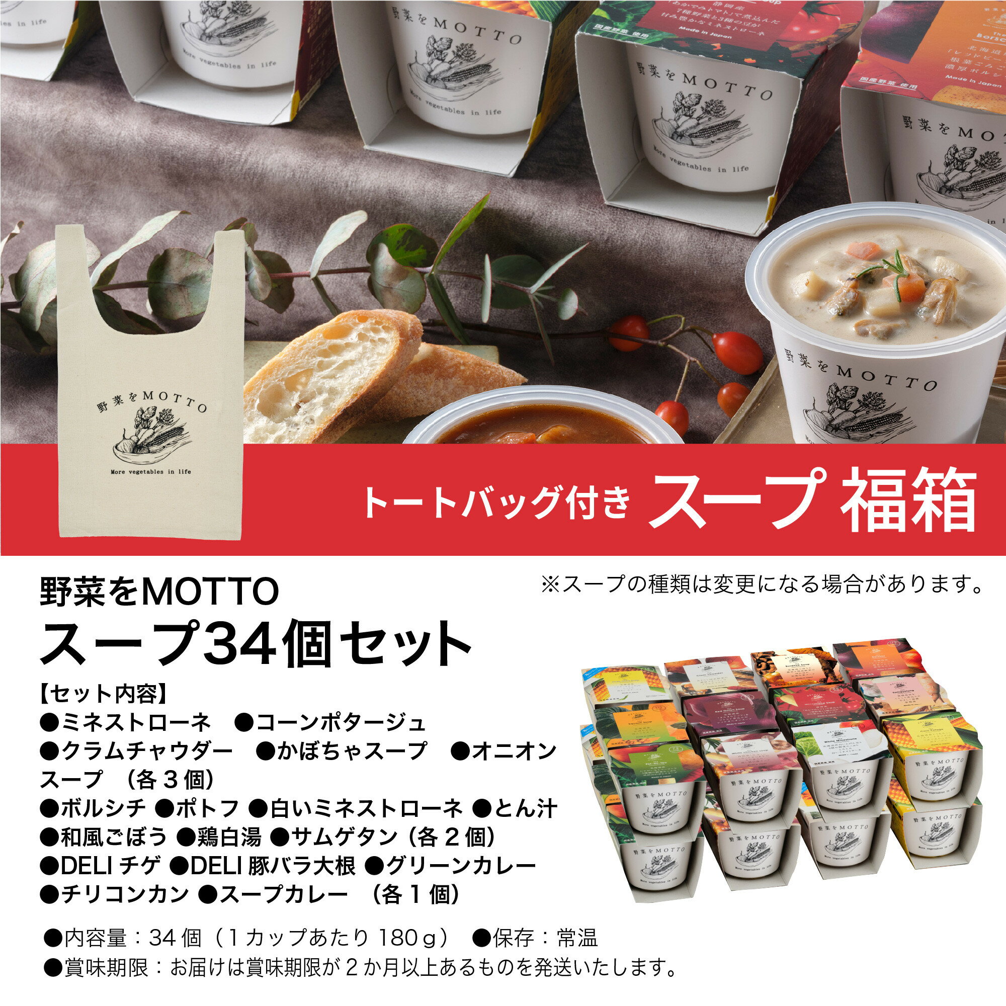 【ふるさと納税】残りわずか!《 12月~1月15日まで期間限定 》 レンジで1分 野菜をMOTTO スープ 福箱 34個入り トートバッグ付 福袋 訳あり 大容量 2026 レトルト インスタント コスパ 増量中 国産 ダイエット スープ 具だくさん 時短 手軽◆