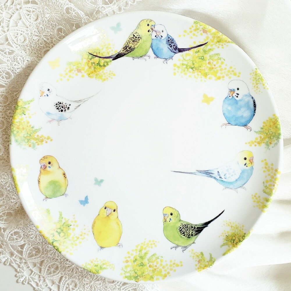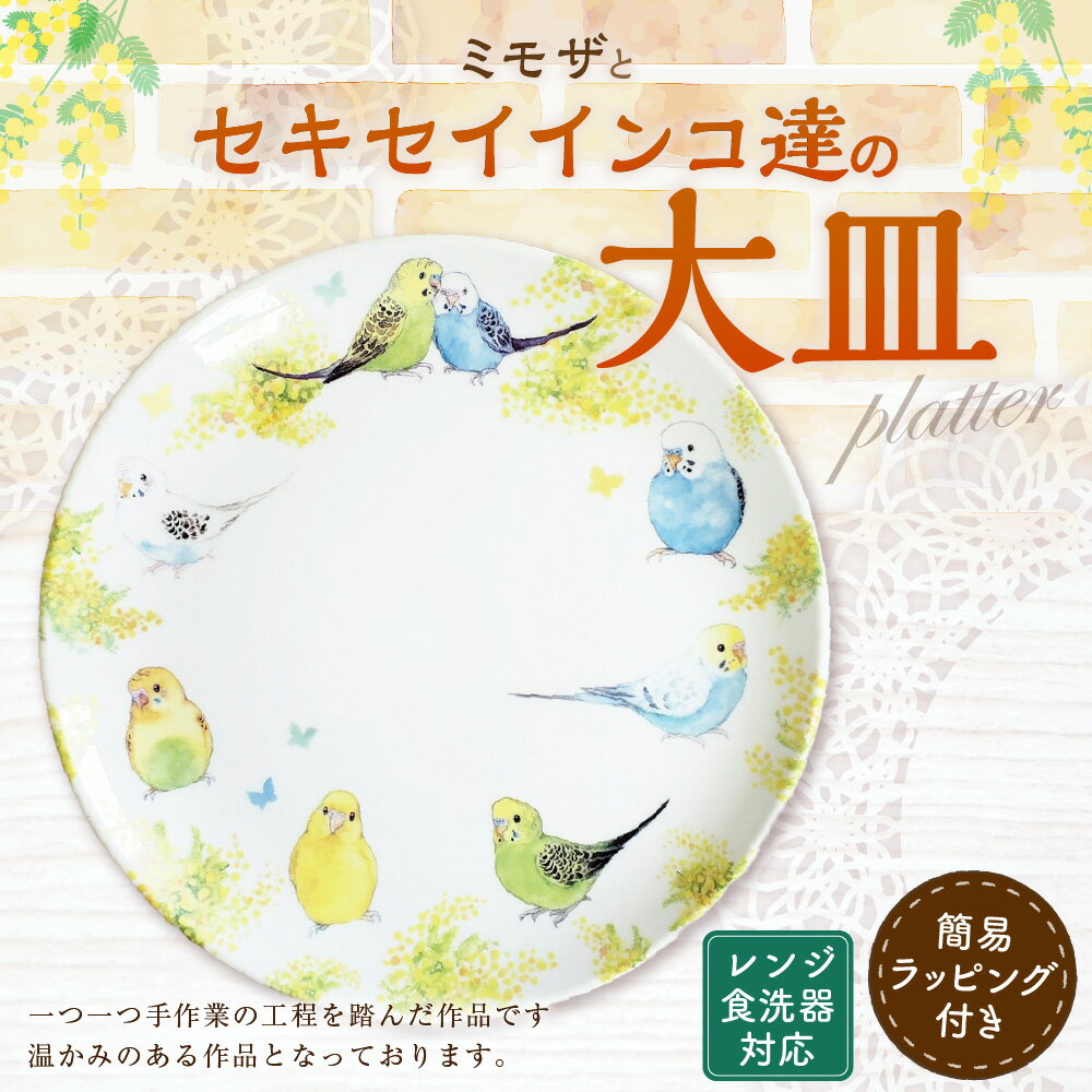 - 【ふるさと納税】ミモザとセキセイインコ達の大皿 大皿 皿 プレート セキセイインコ インコ 水彩絵 アート アートプレート アート作品 小鳥 鳥 ギフト プレゼント