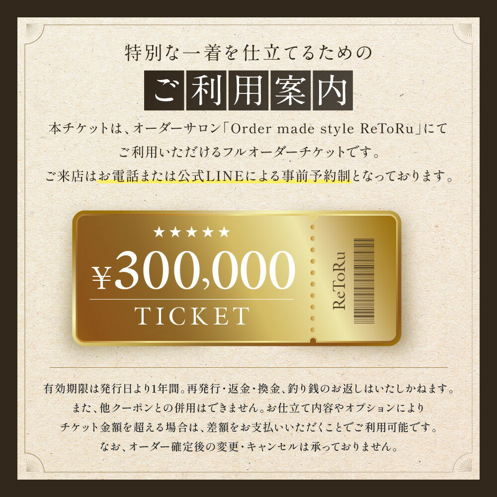 - 【ふるさと納税】フルオーダースーツ専門店「Order made style ReToRu(レトル)」フルオーダーチケット<30万円分>