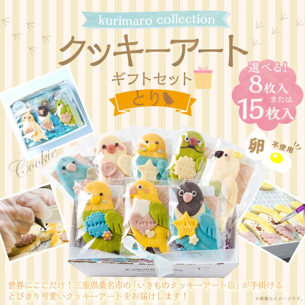 - 【ふるさと納税】<選べる内容量> 【卵不使用】 kurimaro collection とりクッキーアートギフトセット 8枚入 / 15枚入 どうぶつ 鳥 トリ かわいい 可愛い 小麦100% ひよこ豆の煮汁 天然塩 合成着色料不使用 お菓子 焼菓子 スイーツ デザート おやつ 三重県 桑名市 送料無料