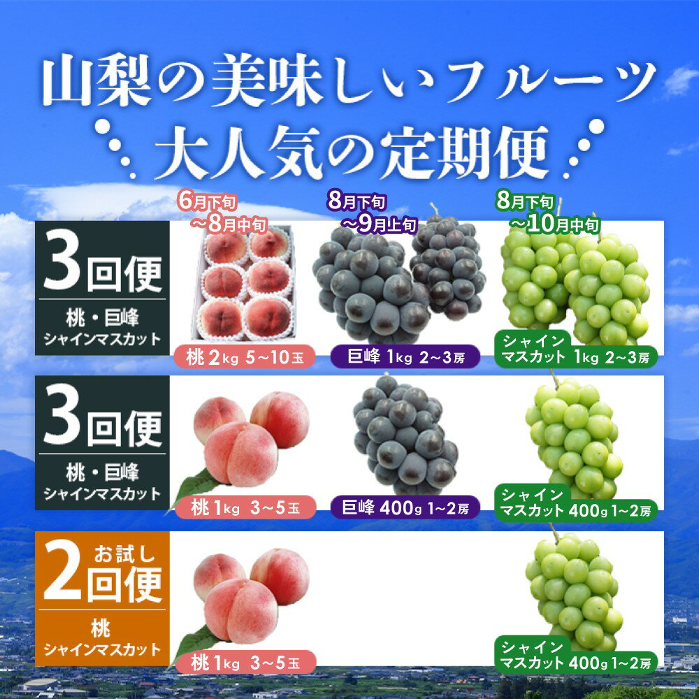 - 【ふるさと納税】【2026年発送★先行予約】選べる 訳あり定期便 フルーツ 2回 3回 桃 巨峰 シャインマスカット 盛り合わせ ぶどう 果物 1房 2房 農家直送 朝採れ 山梨県 数量限定 種無し 旬 産地直送 果実 贈答 ギフト 家庭用 6月 7月 8月 154-056/057/058