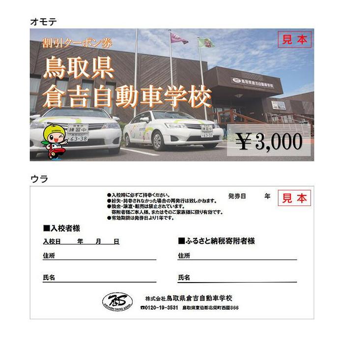 - 【ふるさと納税】638.鳥取県倉吉自動車学校 教習料金割引クーポン【3,000円分】※着日指定不可 | 教習所 免許 車 自動車 クーポン 利用券 チケット 3000円 自動車学校 鳥取県 北栄町 おすすめ 人気