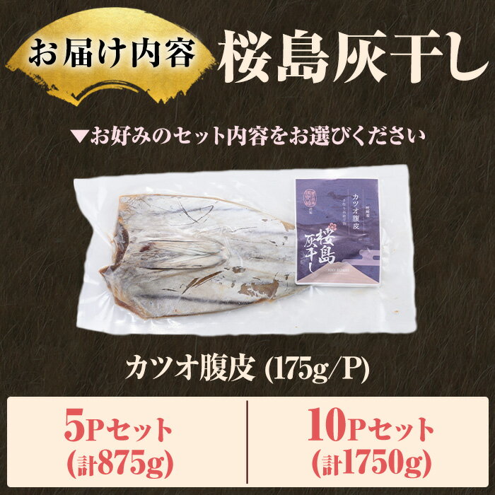 - 【ふるさと納税】<容量選べる>桜島灰干し鹿児島県産カツオ腹皮(計5~10P) 干物 魚 魚介 海産物 焼き魚 惣菜 おつまみ おかず 桜島 灰干し 冷凍 簡単調理 晩御飯 晩ごはん 朝食 朝ごはん 朝ご飯 和食 定食 カツオ 腹皮 保存料無添加 【マルハニチロ】