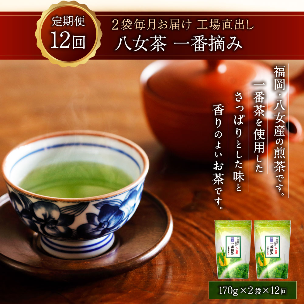 - 【ふるさと納税】 【12ヶ月定期便】毎月お届け 工場直出し 八女茶 一番摘み 合計4.08kg(170g×2袋×12回) 1回あたり 合計340g(170g×2袋) 工場直出し 緑茶 煎茶 お茶 茶葉 福岡県 八女市産 送料無料 E5