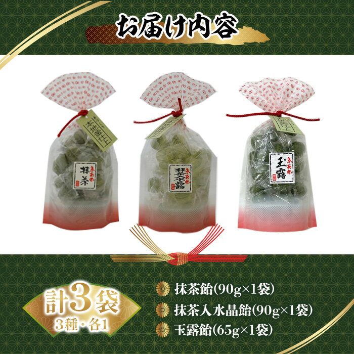【ふるさと納税】茶飴 3種 セット(抹茶飴・抹茶入り水晶飴・玉露飴×各1袋) 京飴 飴 抹茶 抹茶飴 抹茶入水晶飴 玉露飴 お茶 詰め合わせ 贈答 プレゼント 【uj-AM006】【岩井製菓】