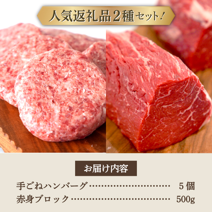 - 【牧場直送】人気返礼品セット!しろいし牛 手ごねハンバーグ 5個&赤身ブロック(ローストビーフ用) 500g【有限会社佐賀セントラル牧場】 [IAH180]