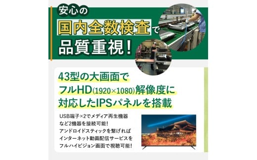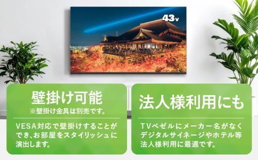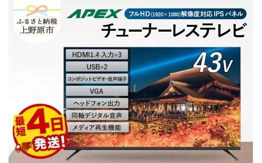 - 【最短4日発送】 チューナーレステレビ 43型 ダイコーアペックス 液晶モニター (AP43APXB) セカンドテレビ 43V 子ども用 寝室用 フルハイビジョン 壁掛け可能 VESA対応 家電 電化製品 43インチ 法人用にもおすすめ ホテル 学校 病院 デジタルサイネージ ダイコーアペックス 送料無料 山梨県上野原市