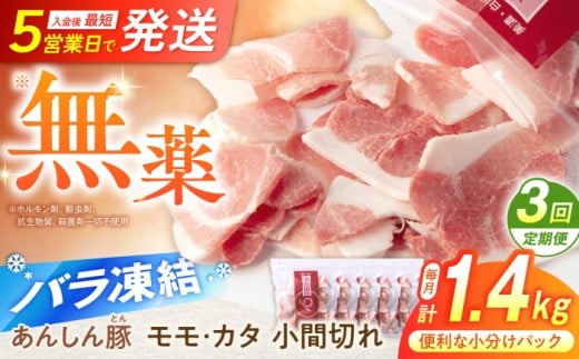【3回定期便】《バラ凍結》 無薬育ちの豚肉 あんしん豚 モモ・カタ 小間切れ 1.4kg (280g×5袋)/ 豚肉 定期便 小分け 薄切り 豚こま 国産 国産豚肉 無薬育ち 薬不使用 大容量 切り落とし 豚コマ 豚小間 冷凍 ストック 大容量 無薬育ち 切り落とし 豚切り落とし 豚こまぎれ 豚こま切れ ぶたこま モモ肉 カタ肉 3万5千円 35000円 白川町 / 藤井ファーム[AWAF030]