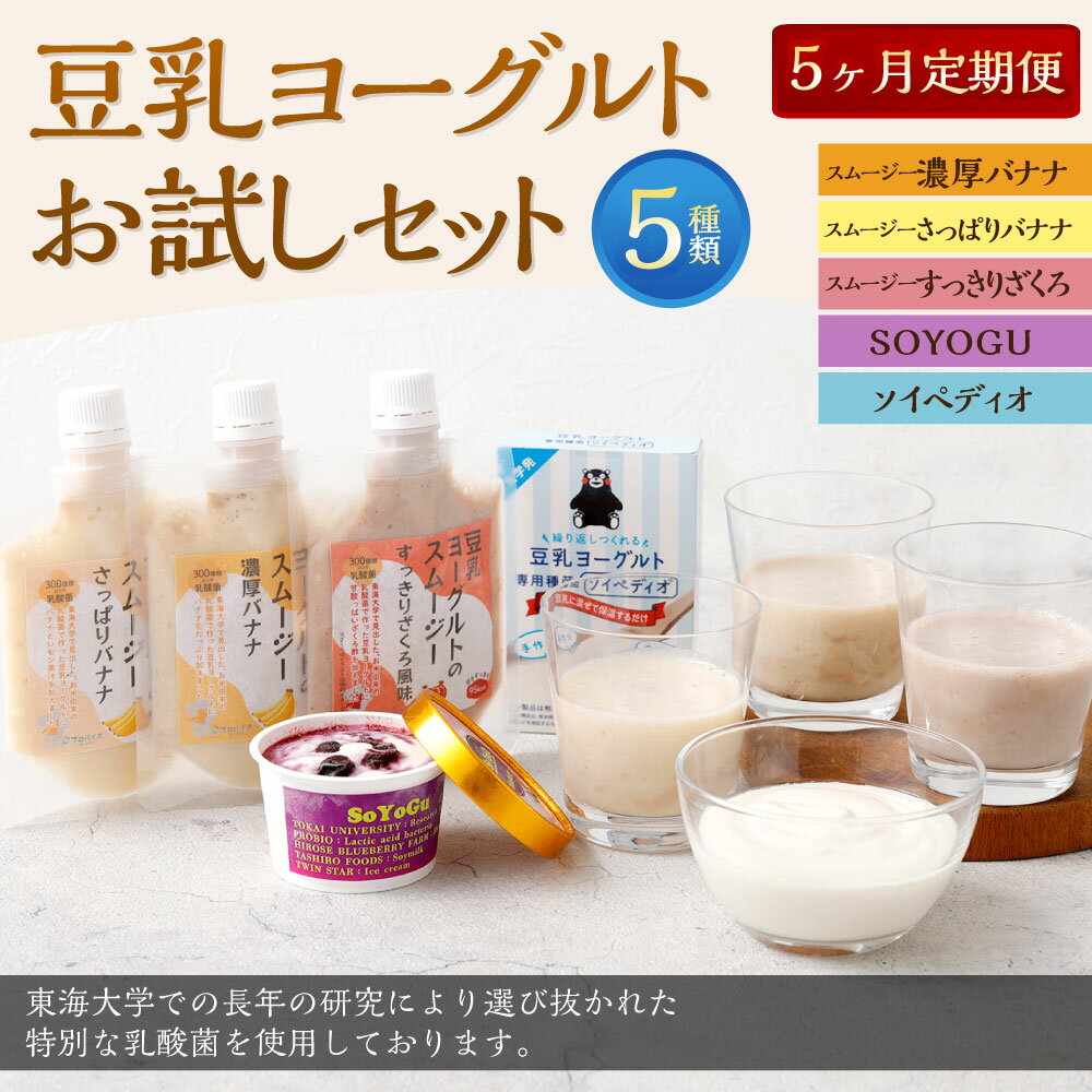 - 【ふるさと納税】【5カ月連続定期便】豆乳ヨーグルトお試しセット 豆乳ヨーグルトスムージー(3種)・豆乳ヨーグルト専用種菌「ソイペディオ」・SOYOGU スムージー 1ヶ月毎 5回 アイスクリーム バナナ ザクロ 乳酸菌 飲料 ドリンク スイーツ デザート 九州 熊本県 送料無料