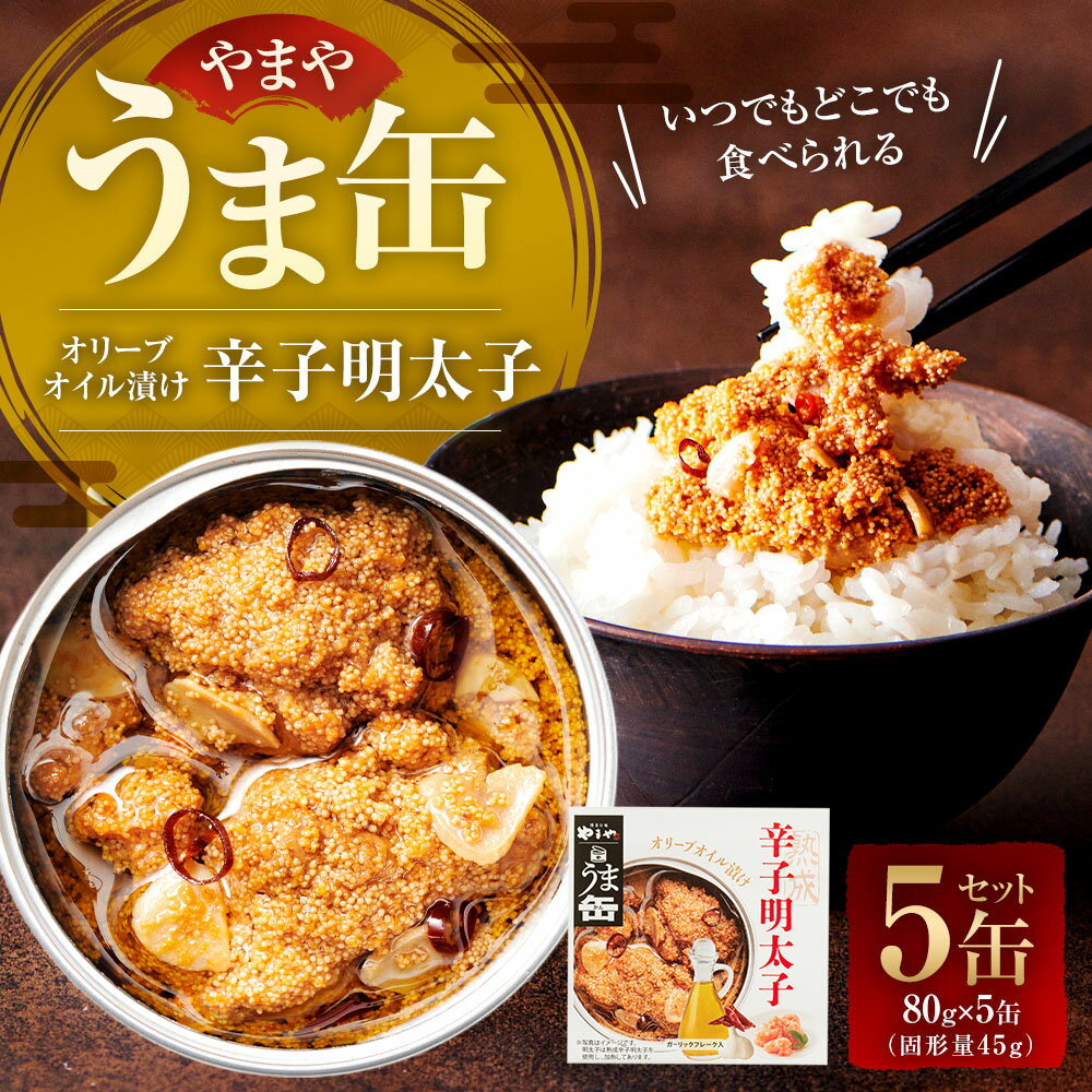 - 【ふるさと納税】やまや うま缶 辛子 明太子 5缶 セット 1缶あたり 80g(固形量45g) 計約400g(計約225g)めんたいこ 海鮮 魚卵 おつまみ ごはん オイル漬け オリーブオイル 缶詰 非常食 防災 保存食 備蓄 長期保存 非常用 ローリングストック 災害備蓄 防災備蓄 福岡県 大任町