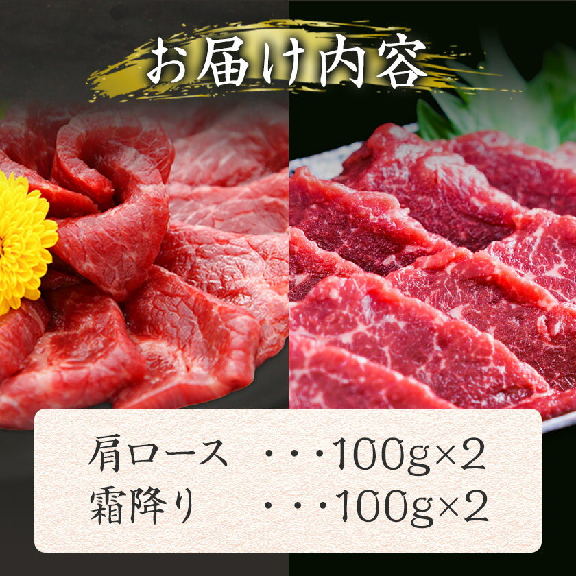 - 【ふるさと納税】馬刺し 肩ロースと霜降りセット 2種類 合計400g 肩ロース 100g×2パック 霜降り 100g×2パック 有限会社七城町特産品センター《90日以内に出荷予定(土日祝除く)》熊本県 菊池市 肉 馬肉 セット 食べ比べ ブロック 送料無料