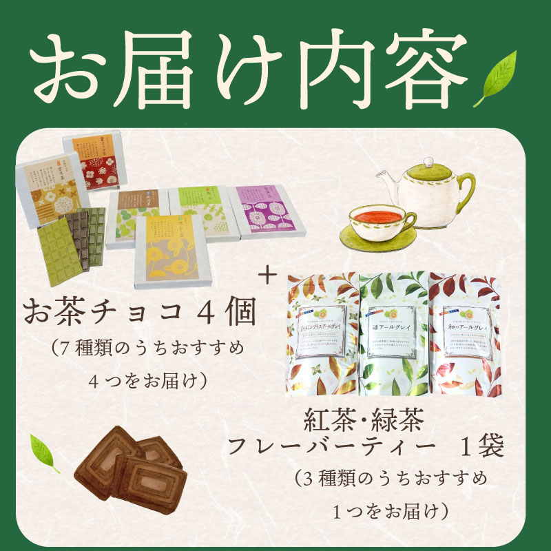【ふるさと納税】 お茶チョコと紅茶・緑茶フレーバーティーセット お茶チョコ 4個 緑茶 紅茶 フレーバーティー 1袋 無香料 保存料なし ギフト 抹茶 ほうじ茶 玉露 深蒸し茶 煎茶 掛川茶 玄米茶 茶味 茶 おちゃ 水出し お湯出し 兼用 ティーバッグ 喜作園 静岡県 牧之原市