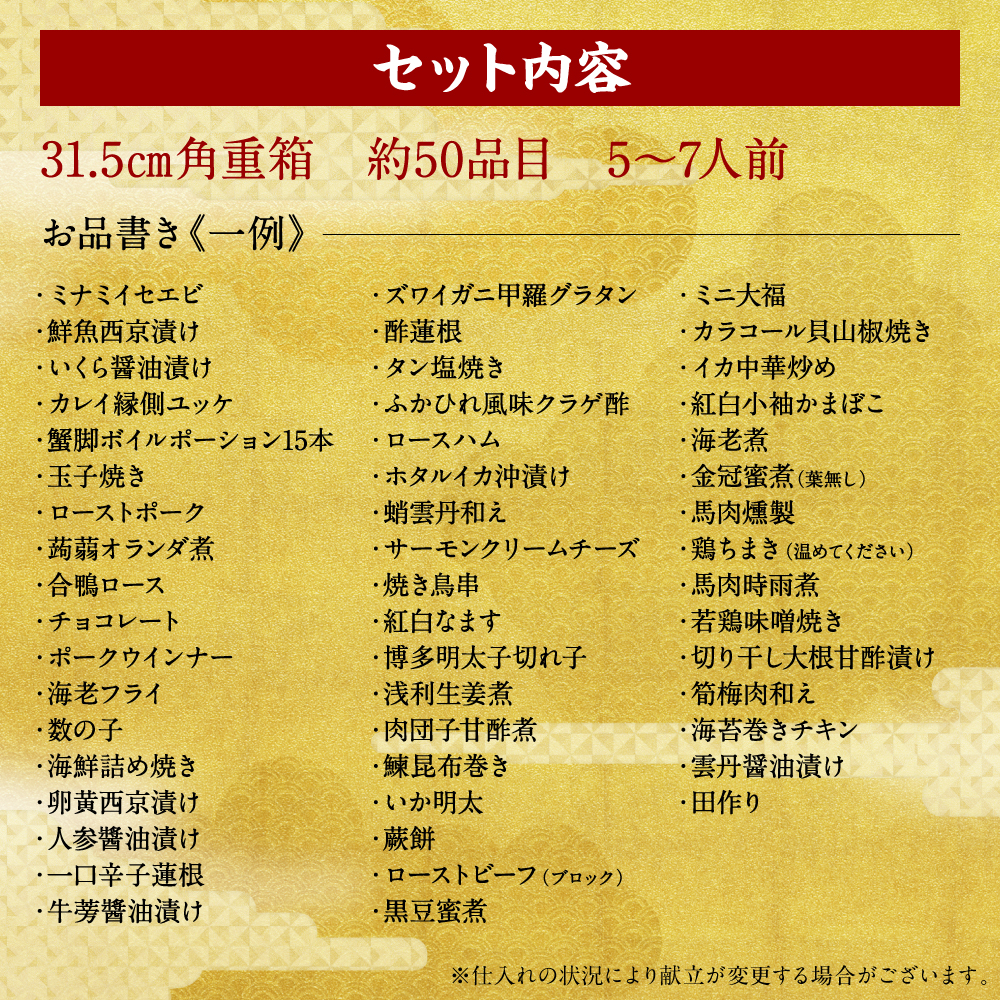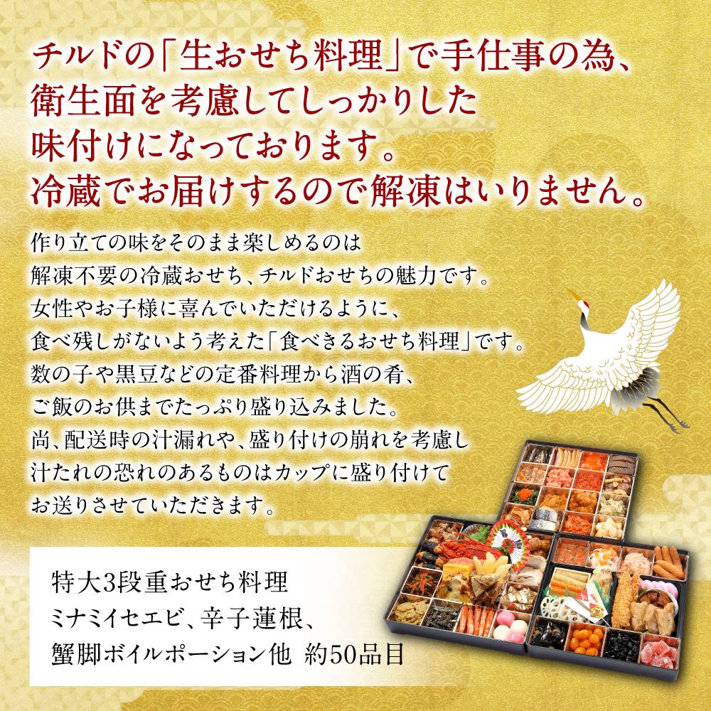 - 【先行予約】 熊本県八代市特大10.5寸 3段重チルド「女性やお子様が喜ぶおせち料理」 寿司日本料理 葵 約50品目 5-7人前 ローストビーフ100gと蟹脚ボイルポーション15本付き お節 おせち おせち料理 年末配送 グルメ お取り寄せ 新春 正月 【2026年12月31日お届け】