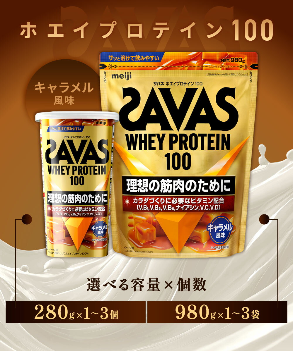【ふるさと納税】ザバス ホエイプロテイン100 キャラメル風味 <選べる内容量> 1個(280g) / 2個(計560g) / 3個(計840g) / 1個(980g) / 2個(計1.96kg) / 3個(計2.94kg) トレーニング 筋トレ カラダづくり たんぱく質 飲料 ドリンク 健康食品 SAVAS 送料無料