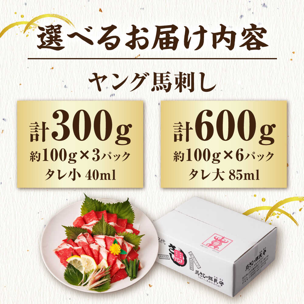 【ふるさと納税】《選べる容量!》ヤング馬刺し 計約300g~約600g(約100g×3~6パック) タレ付き 馬刺し ヤング 馬刺し 馬肉 桜肉 馬 肉 便利 小分け コリコリ 冷凍 生食 刺身 九州 熊本県 山鹿 送料無料 【馬刺しの郷 民守】[ZBL012]