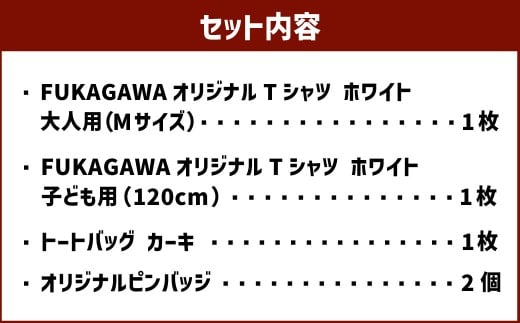 【大人:Mサイズ×子ども:120サイズ】FUKAGAWAオリジナルTシャツ ホワイト(大人用・子ども用)・トートバック・オリジナルピンバッチ2個セット シャツ Tシャツ 服 ピンバッチ バック トートバッグ カーキ 北海道 深川市