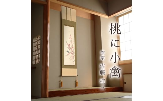 掛け軸「桃に小禽」 佐藤桂三 半切立 サイズ:47×190cm 桐箱付 掛け軸 和室 おしゃれ 日本画 表装 床の間