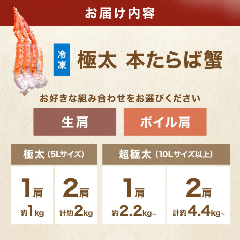 - 【ふるさと納税】数量限定 選べる サイズ 種類 内容量 !【極太5Lサイズ】【1肩約2.2kgの10Lサイズ】 本たらば蟹 生肩 ボイル肩 約1kg 約2kg 約2.2kg~ 約4.4kg~【ふるさと納税3.0】