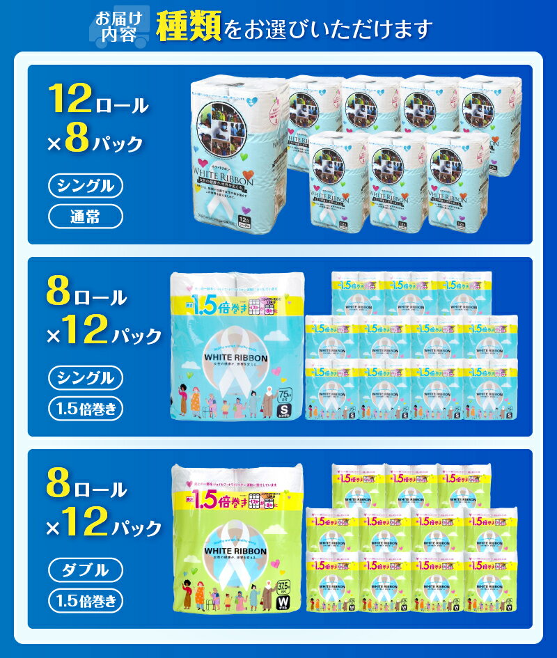 - 【ふるさと納税】 【女性支援】 高評価★4.81 トイレットペーパー シングル「ホワイトリボン」 96ロール 選べる種類 通常巻きシングル/1.5倍巻きシングル/1.5倍巻きダブル 再生紙 無香料 無色 クラフト包装 ジョイセフ・ホワイトリボン運動寄付 生活必需品 [sf068-001-038]