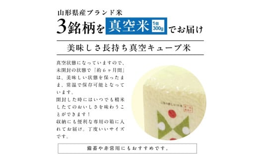 - 真空キューブ米 精米 1個あたり300g 山形県産 令和7年産米 つや姫 雪若丸 コシヒカリ 東北 山形県 遊佐町 庄内地方 ブランド米 庄内米 ごはん ご飯 セット(各1個ずつ)