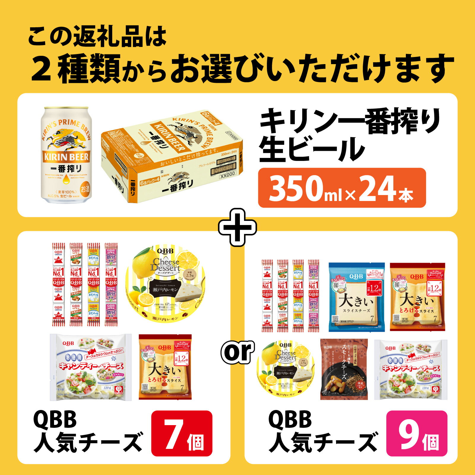 - 【ふるさと納税】【選べる内容量】キリン一番搾り 350ml 24本 と QBB商品 7品 or 9品 / ビール キリンビール キリン 麒麟 KIRIN お酒 アルコール 缶ビール 缶 生ビール 神戸 工場 チーズ おつまみ 晩酌 ギフト 兵庫県