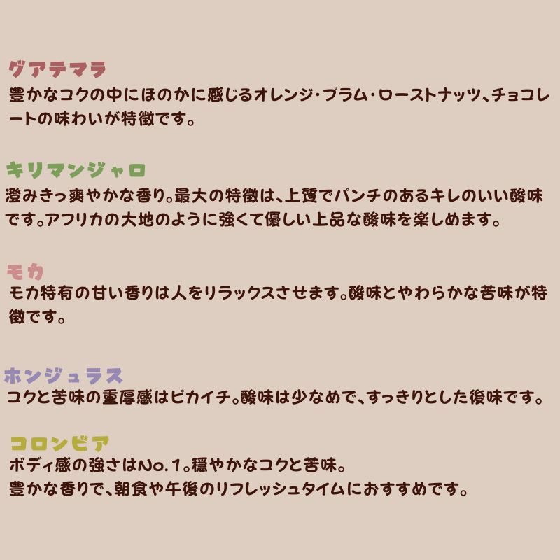 きれいなコーヒーレギュラー珈琲5種セット(豆)200g×5袋【A8-030】