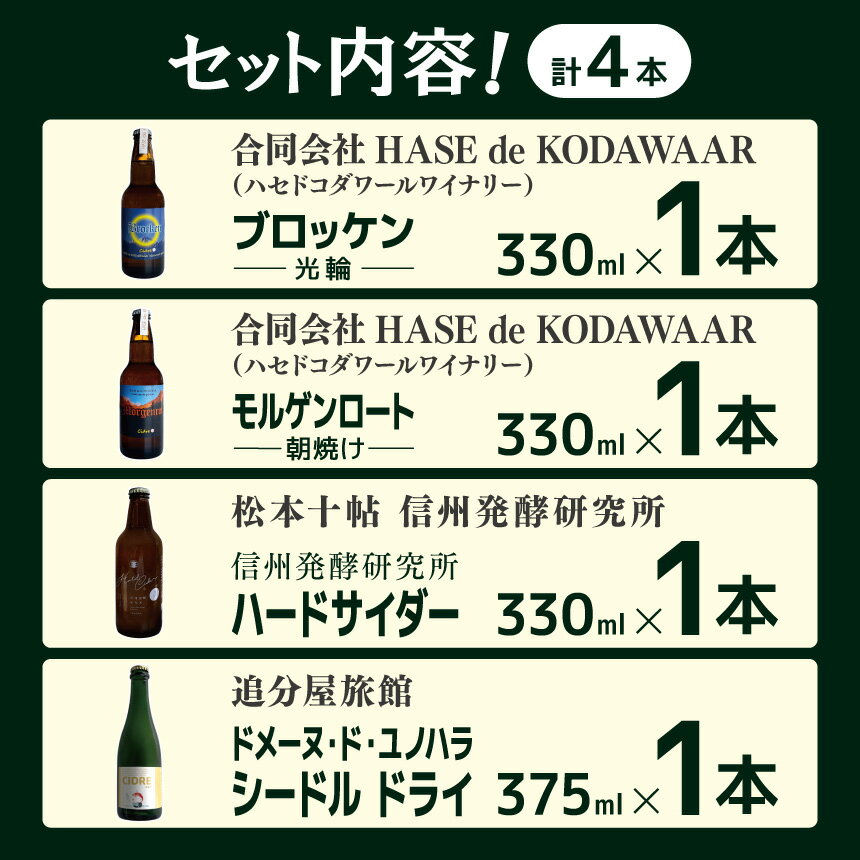 - 【ふるさと納税】松本シードル辛口4種各1本セット|シードル 辛口 飲み比べ 味わい ブロッケン モルゲンロート ハードサイダー 飲料 アルコール さけ 酒 飲酒 ふるさと納税 松本市