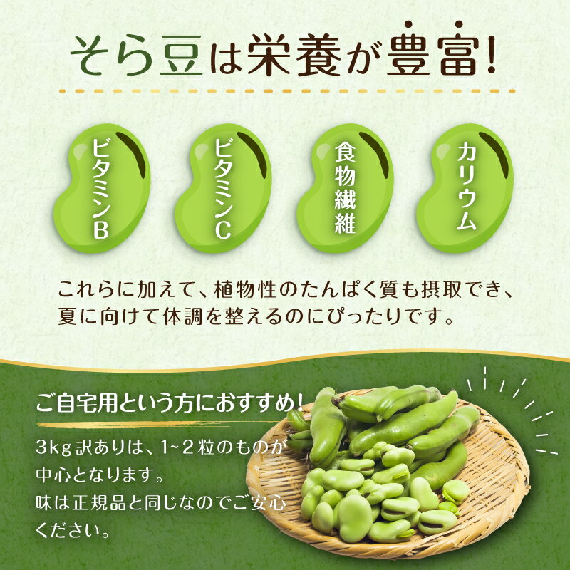- 【ふるさと納税】 【先行受付2026年4月下旬よりお届け】(訳あり)そら豆3kg 千葉県 南房総市 野菜 旬 新鮮 香り 甘み シンプル 塩茹で そら豆ご飯 パスタ 春巻き ポタージュ 天ぷら フリット アヒージョ おつまみ 送料無料