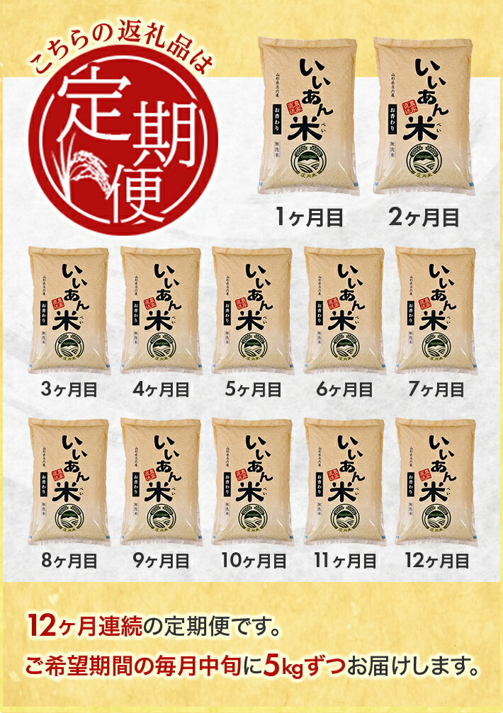 - 【ふるさと納税】≪12ヶ月定期便≫ 無洗米 お香わり(山形95号) 5kg×12ヶ月連続 計60kg 山形県庄内産 ご希望期間の毎月中旬頃お届け 産地直送 定期便 米 お米 精米 白米 庄内米 いいあん米 東北 酒田市 アグレスト JGAP認証農場