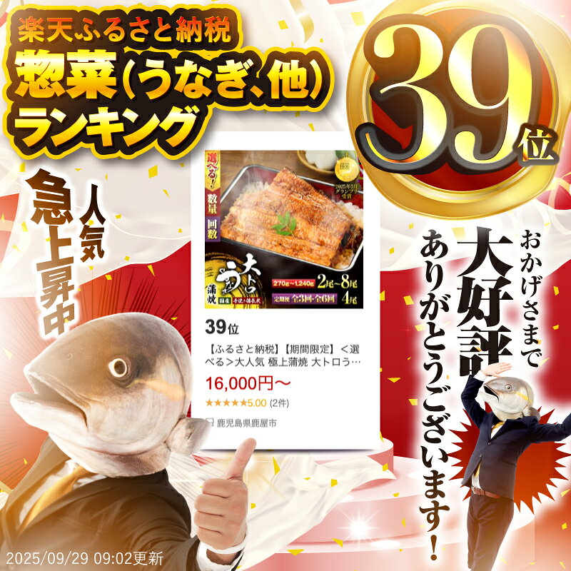 - 【ふるさと納税】【数量限定 期間限定】<選べる>大人気 極上蒲焼 大トロうなぎ 蒲焼 1尾~8尾 定期便 訳あり 国産 手焼き備長炭 本格 鰻 ウナギ 魚 惣菜 総菜 冷凍 湯煎 レンジ 解凍 簡単調理 鰻丼 鰻重 土用の丑 鯉家 鹿屋市 おすすめ ランキング プレゼント ギフト