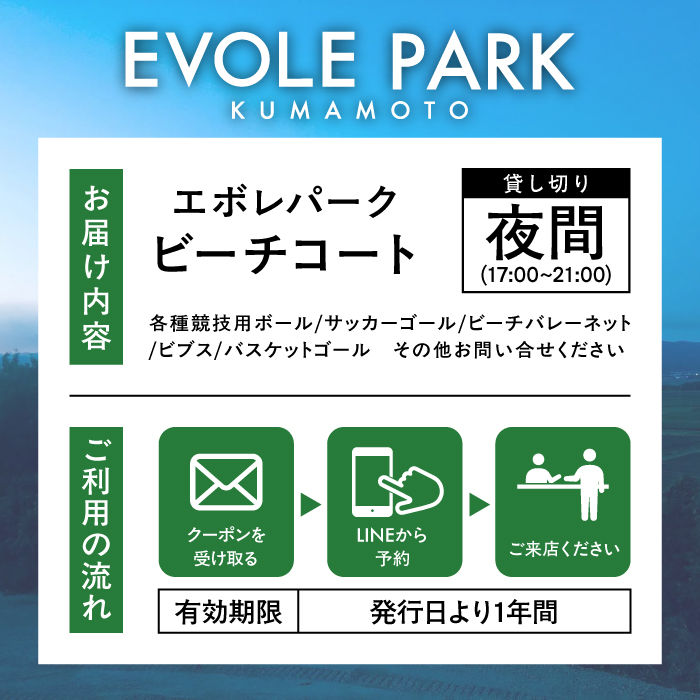 エボレパーク 夜間プラン 利用券 ビーチスポーツ ビーチバレー ビーチサッカー スクール ダイエット 運動 レクリエーション イベント フェス 菊陽町 熊本【エボレジャパン株式会社】 [BHBC010]