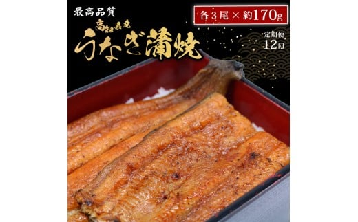【12回定期便】 うなぎ 蒲焼 約170g×3尾 高知県産 最高品質 合計 約510g たれ 山椒 国産 鰻 かば焼 かばやき 蒲焼き かば焼き 土佐焼 うな丼 うな重 土用 丑 贈答 高知県 南国市