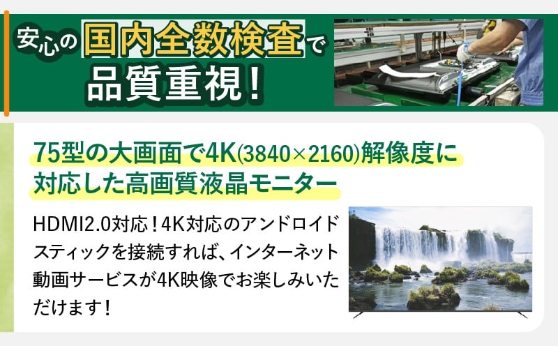 チューナーレステレビ 75型 ダイコーアペックス 4K対応 液晶モニター (AP75DPX) セカンドテレビ 75V 子ども用 寝室用 ウルトラハイビジョン 壁掛け可能 VESA対応 家電 電化製品 75インチ 法人用にもおすすめ 会議室 ホテル 学校 病院 デジタルサイネージ 送料無料 山梨県上野原市