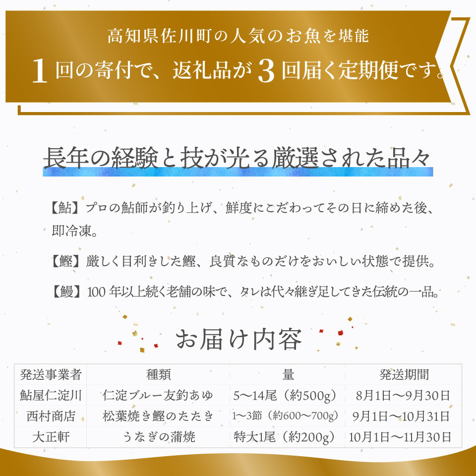 - <年3回【さかわのお魚定期便(配送月:8月~11月)】>うなぎ かつおのタタキ 鮎 鰹のタタキ 高知県 大正軒 鮎屋仁淀川 西村商店 かつおのたたき 鰻蒲焼き あゆ ※※配送できない地域があります※※