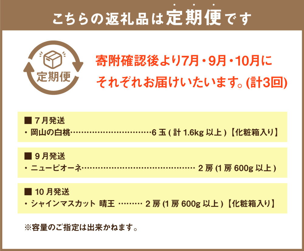 【ふるさと納税】【3回定期便】岡山県産 フルーツ定期便コース (白桃・ニューピオーネ・晴王) 計約4kg 【2026年7月上旬発送開始】 白桃 桃 もも ニューピオーネ シャインマスカット 晴王 ぶどう 葡萄 マスカット フルーツ 果物 くだもの 岡山県 奈義町 送料無料