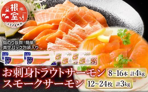 E-09004 お刺身トラウトサーモン8~16本(計4kg)&スモークサーモン12~24枚(計3kg)