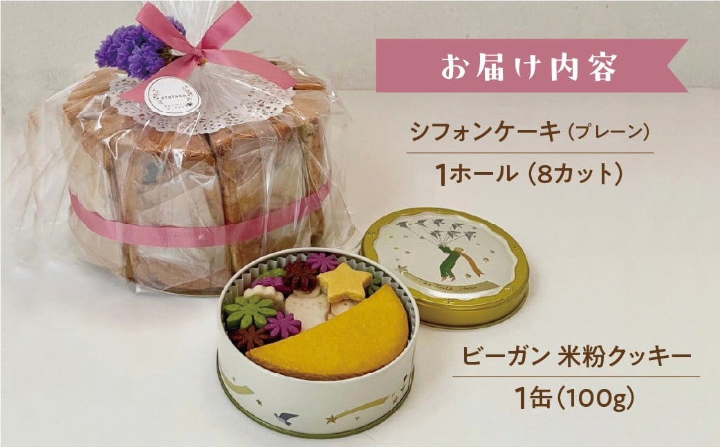 【母の日・発送時期が選べる】素材の味そのままプレーンシフォンケーキ (1ホール 8カット)と ビーガン米粉クッキー 1缶 (100g)のセット ギフト プレゼント 手作り こだわり おすすめ 馬瀬 下呂市 洋菓子 ケーキ カット済み 個包装 シフォンケーキ グルテンフリー 猫型 ネコ型 ヴィ―ガン