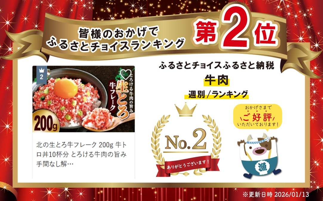 ランキング第2位獲得!北の生とろ牛フレーク 200g 牛トロ丼10杯分 とろける牛肉の旨み 手間なし解凍不要 北海道 別海町 ( ふりかけ 肉 牛 牛肉 国産 霜降り 冷凍 どんぶり 丼 人気 ちらし寿司 冷凍 ギフト 取り寄せ 国産 トロ ふりかけ 北海道 ふるさとチョイス ふるさと納税 仕組み キャンペーン 限度額 計算 ランキング やり方 シミュレーション チョイス チョイスマイル )