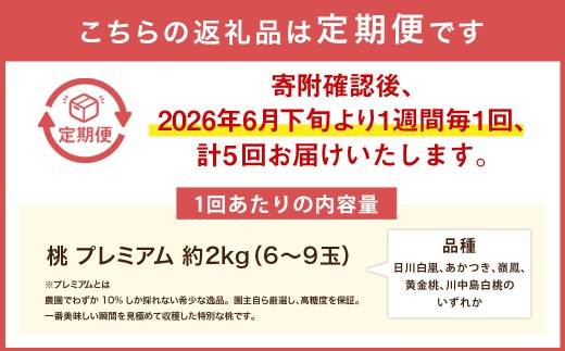 - 桃 プレミアム 約2kg ( 6ー9玉) 【 2026年6月下旬 - 8月上旬発送予定 】【 1週間毎 5回 定期便 】 日川白凰 あかつき 嶺鳳 黄金桃 川中島白桃 もも モモ フルーツ 果物 くだもの 福岡県産 国産 福岡県 うきは市