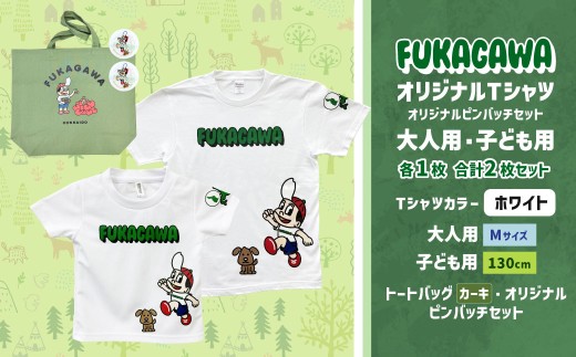 【大人:Mサイズ×子ども:130サイズ】FUKAGAWAオリジナルTシャツ ホワイト(大人用・子ども用)・トートバック・オリジナルピンバッチ2個セット シャツ Tシャツ 服 ピンバッチ バック トートバッグ カーキ 北海道 深川市