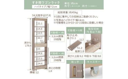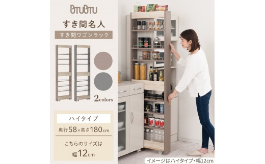 - 【完成品+設置付き】すき間 ワゴンラック ハイタイプ 幅12cm (グレージュ)キッチン 隙間収納 キャスター付き キッチンワゴン スリム 収納 キッチン隙間ワゴン キッチン隙間家具 ラック KKONRA945070-12-GBE